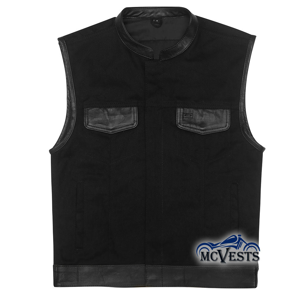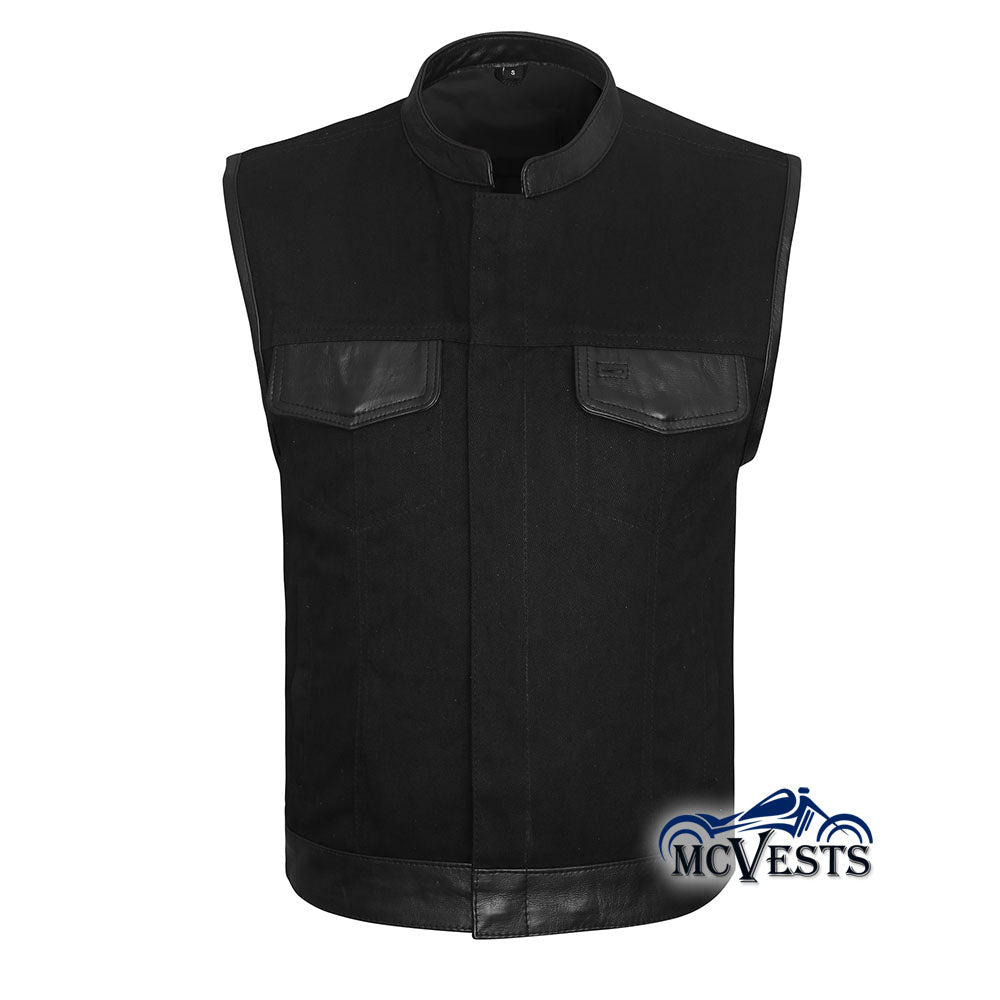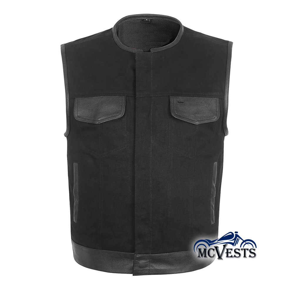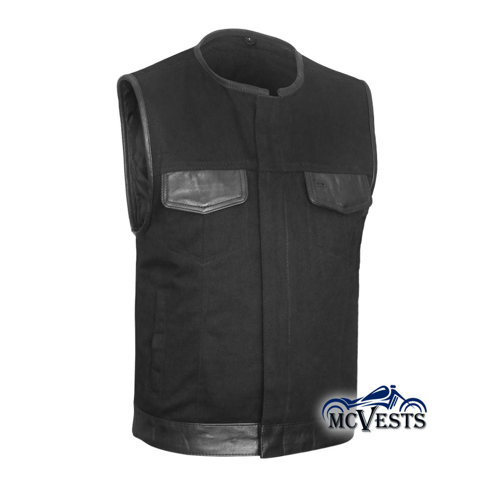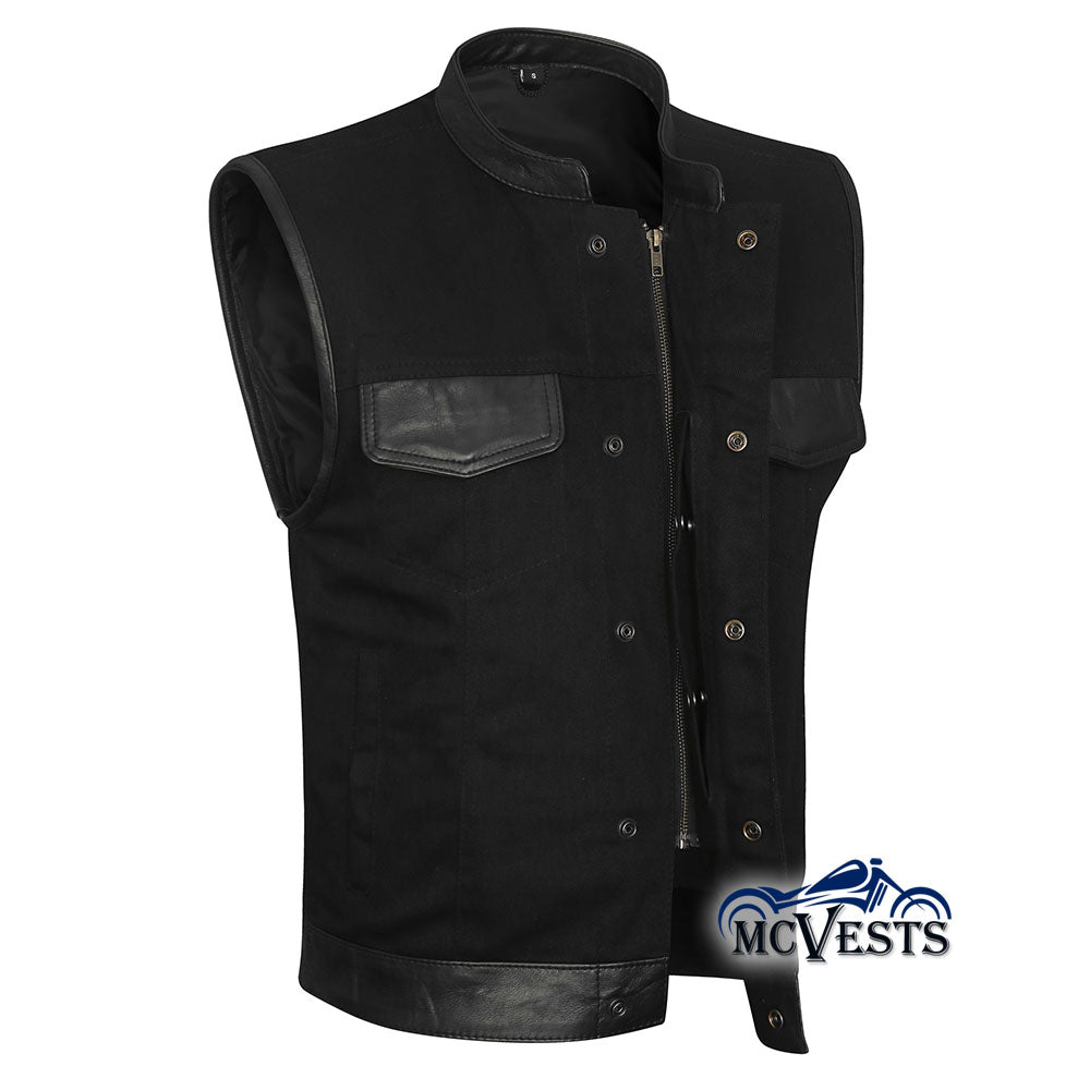 - Black denim motorcycle club vest with leather trim