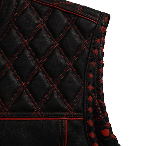 This vest really stands out with the red piping and double diamond stitch pattern. It is a premium club style vest made from naked cowhide leather.