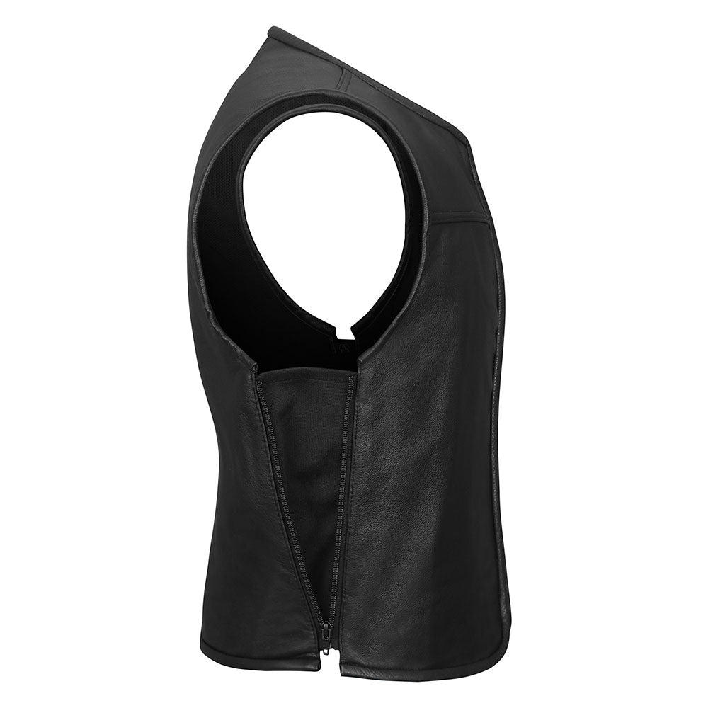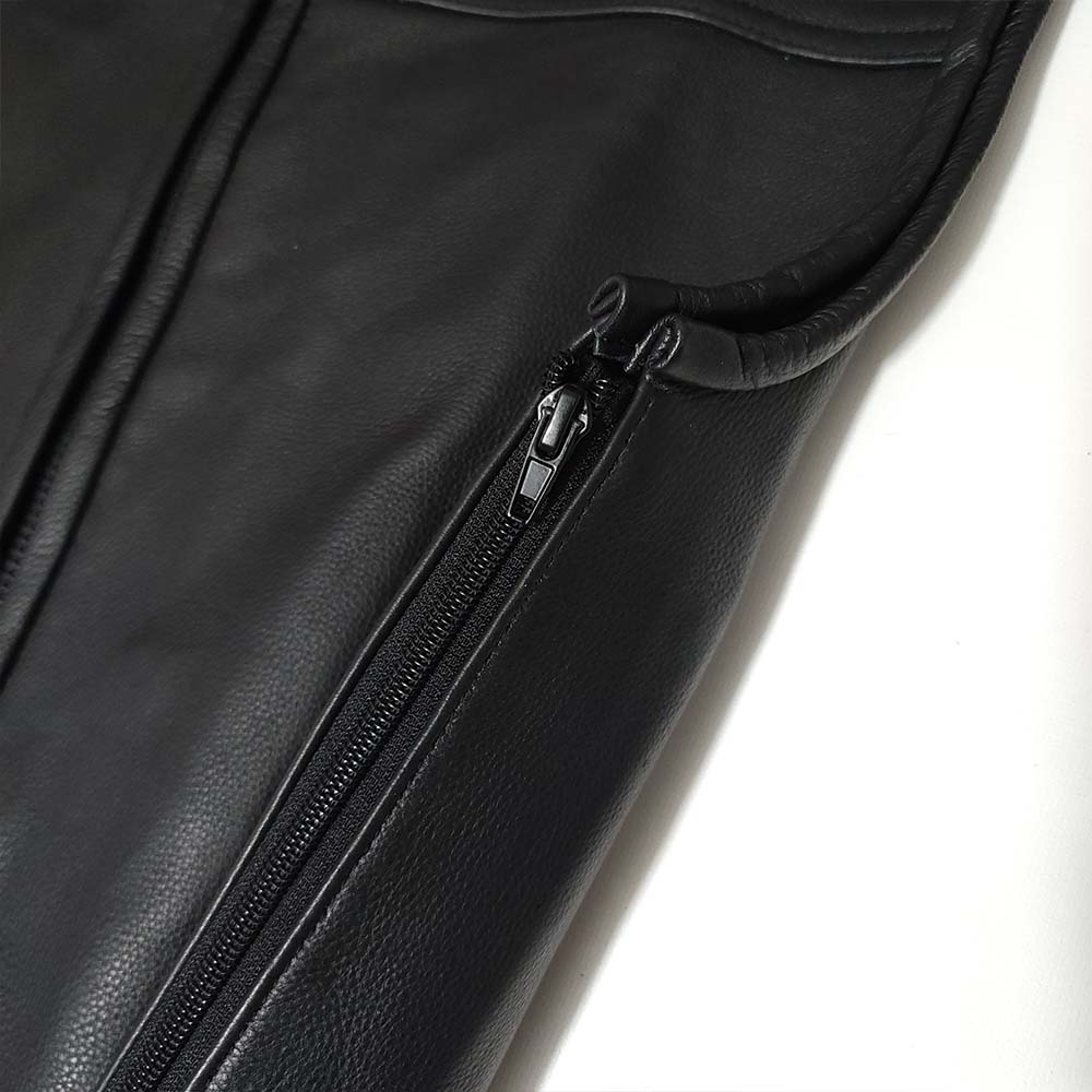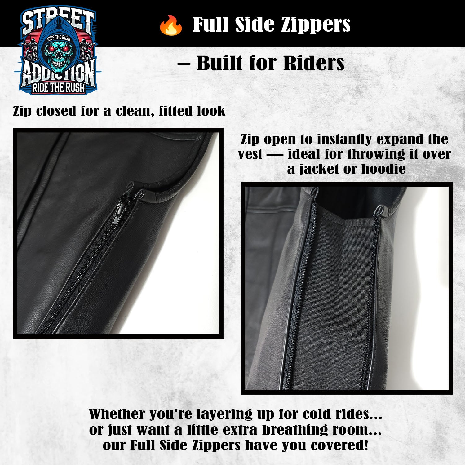 Full-length side zippers offer extra room when needed — perfect for layering over a jacket without compromising fit or style. The single back panel is ideal for club patches, rockers, or custom embroidery, while the clean front design with no pockets makes it easier to add side rockers and other patches.